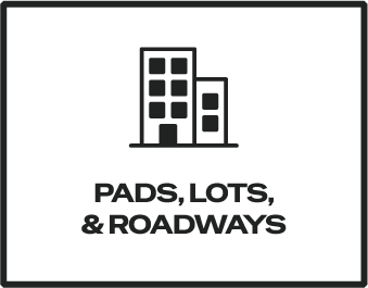 Black and white icon of buildings with the text 'Pads, Lots, & Roadways' beneath.